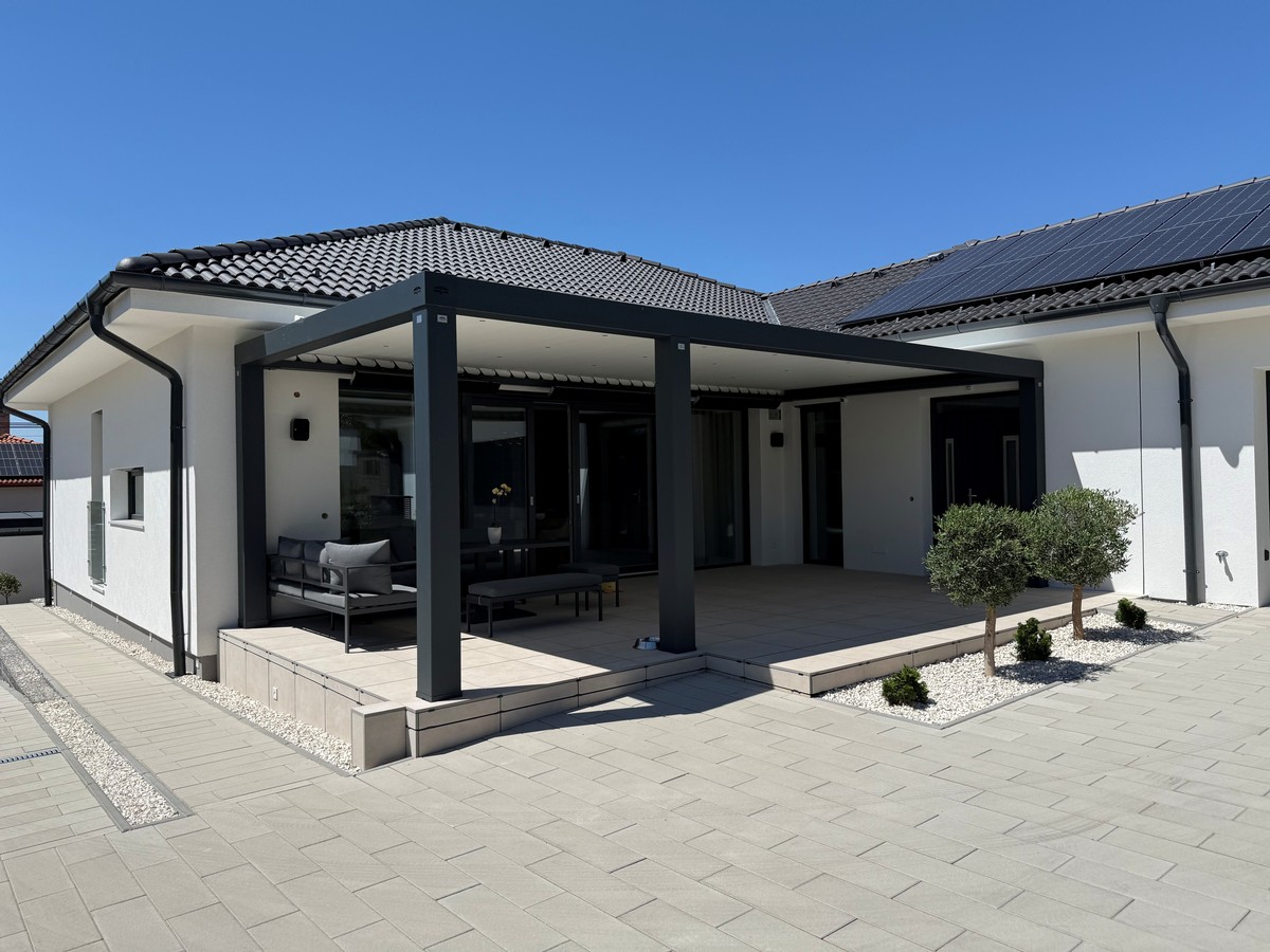 A pergola testre szabható LED világítással, oldalfedésekkel (üvegfal, textilroló, zip-screen), fűtéssel, így egész évben komfortos külső tér alakítható ki.